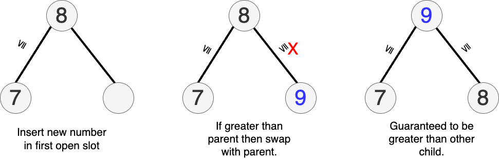 #![allow(unused)] fn main() { impl<T:PartialOrd+PartialEq+Copy> MyBinaryHeap<T> { fn insert_val(&mut self, val: T) { self.heap_size += 1; self.heap.push(val); let mut i = self.heap_size - 1; // loop until we reach root and parent is less than current node while i != 0 && self.heap[Self::parent(i)] < self.heap[i] { // swap node with parent let tmp = self.heap[Self::parent(i)]; self.heap[Self::parent(i)] = self.heap[i]; self.heap[i] = tmp; // update node number i = Self::parent(i); // Self is stand-in for data strucutre MyBinaryHeap } } fn extract_max(&mut self) -> Option<T> { if self.heap_size == 0 { return None; } if self.heap_size == 1 { self.heap_size -= 1; return Some(self.heap[0]); } let root = self.heap[0]; self.heap[0] = self.heap[self.heap_size - 1]; // copy last element self.heap_size -= 1; self.heapify(0); return Some(root); } } }