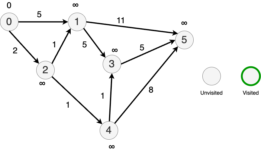 #![allow(unused)] fn main() { let start: Vertex = 0; let mut distances: Vec<Option<Distance> > = vec![None; graph.n]; // use None instead of infinity distances[start] = Some(0); }