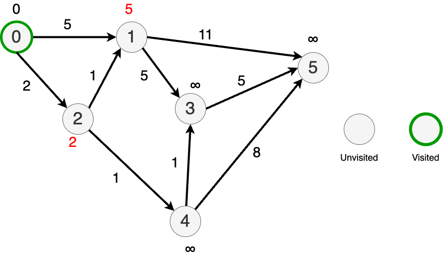 Now go to the "closest" node (node 2) and update the distances to its immediate neighbors.