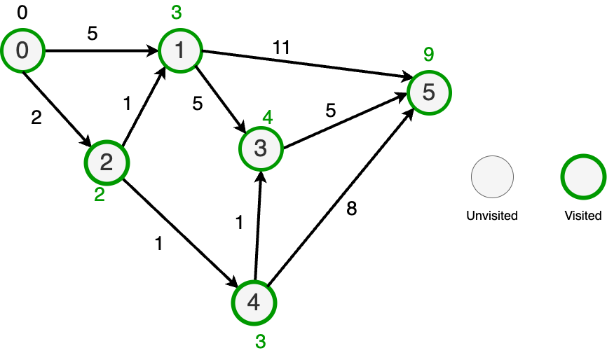 - (this is valid and optimal in connection with the behavior in step 6.: that the next nodes to visit will always be in the order of 'smallest distance from initial node first' so any visits after would have a greater distance).